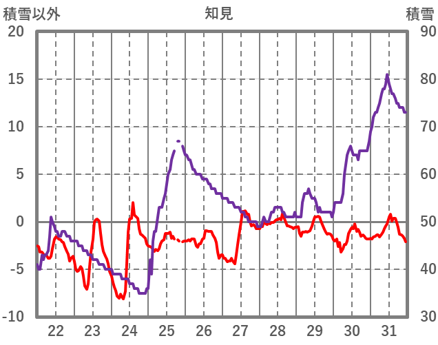 | 日 | 時 | 気温 | 降水 | 風向/風速 | 日照 | 積雪 | 降雪 |