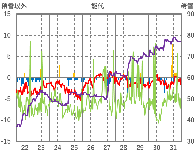 | 日 | 時 | 気温 | 降水 | 風向/風速 | 日照 | 積雪 | 降雪 |