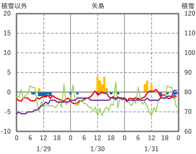 | 日 | 時 | 気温 | 降水 | 風向/風速 | 日照 | 積雪 | 降雪 |
