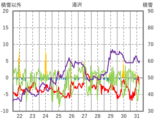 | 日 | 時 | 気温 | 降水 | 風向/風速 | 日照 | 積雪 | 降雪 |