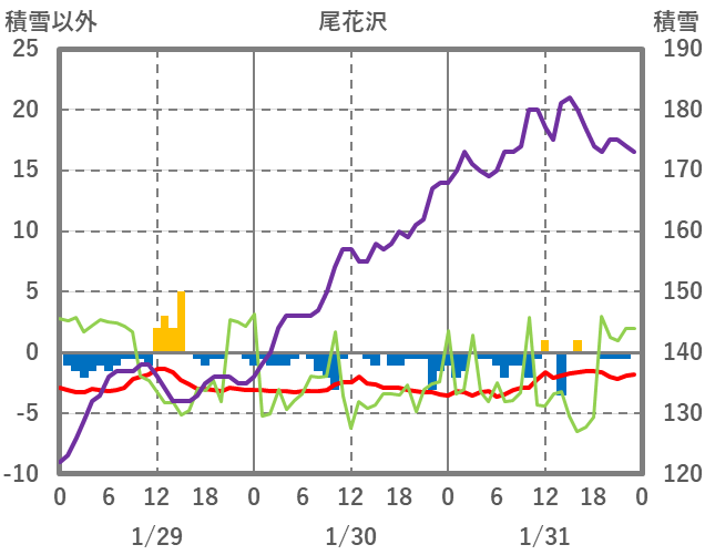 | 日 | 時 | 気温 | 降水 | 風向/風速 | 日照 | 積雪 | 降雪 |