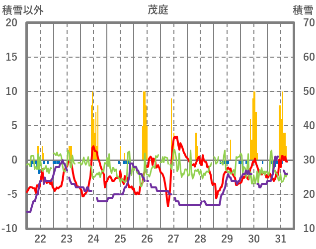 | 日 | 時 | 気温 | 降水 | 風向/風速 | 日照 | 積雪 | 降雪 |