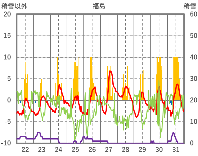 | 日 | 時 | 気温 | 降水 | 風向/風速 | 日照 | 積雪 | 降雪 |