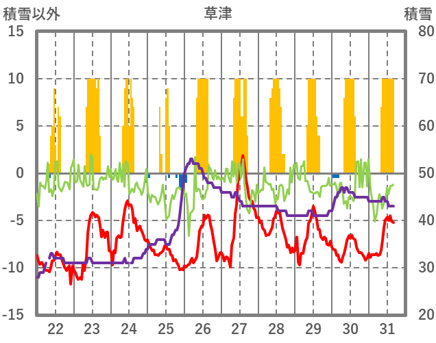 | 日 | 時 | 気温 | 降水 | 風向/風速 | 日照 | 積雪 | 降雪 |