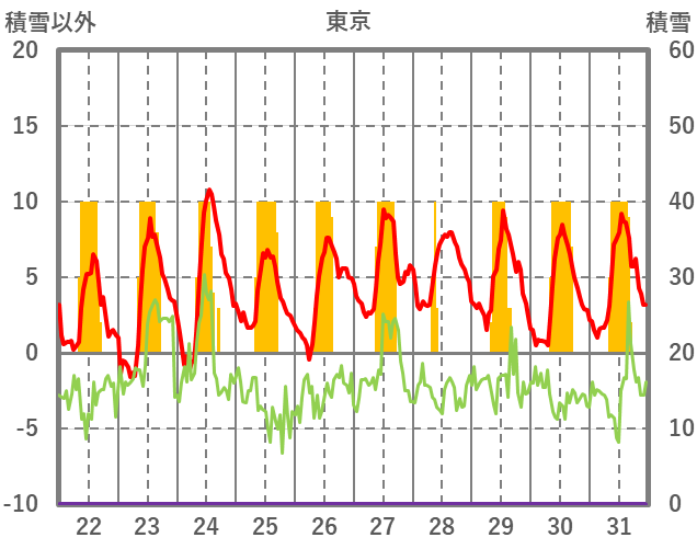 | 日 | 時 | 気温 | 降水 | 風向/風速 | 日照 | 積雪 | 降雪 |