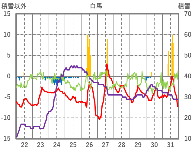 | 日 | 時 | 気温 | 降水 | 風向/風速 | 日照 | 積雪 | 降雪 |