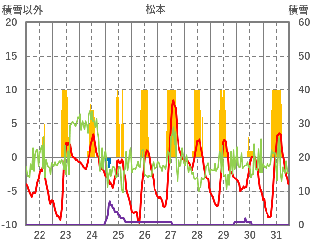 | 日 | 時 | 気温 | 降水 | 風向/風速 | 日照 | 積雪 | 降雪 |