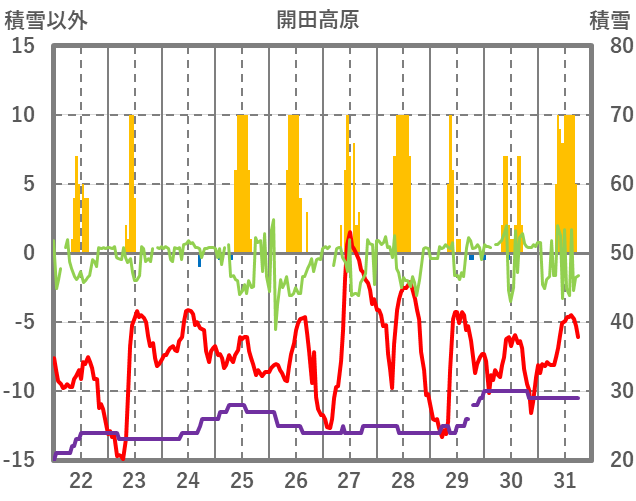 | 日 | 時 | 気温 | 降水 | 風向/風速 | 日照 | 積雪 | 降雪 |