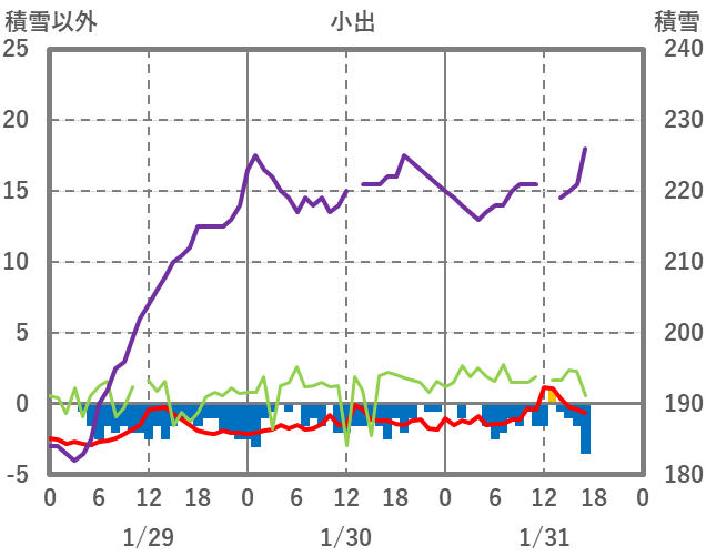 | 日 | 時 | 気温 | 降水 | 風向/風速 | 日照 | 積雪 | 降雪 |