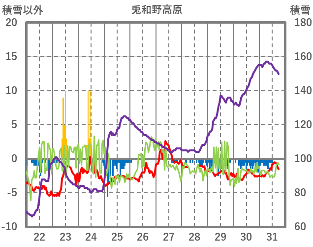 | 日 | 時 | 気温 | 降水 | 風向/風速 | 日照 | 積雪 | 降雪 |