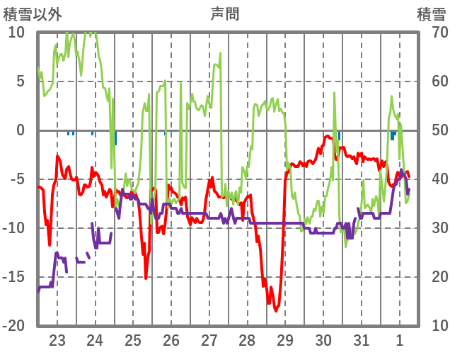 | 日 | 時 | 気温 | 降水 | 風向/風速 | 日照 | 積雪 | 降雪 |
