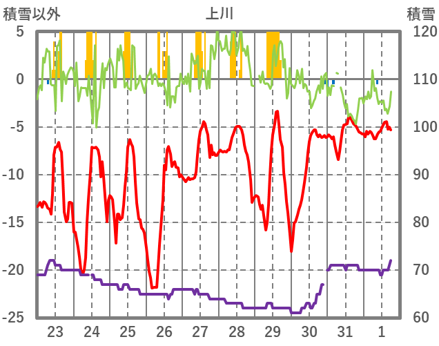 | 日 | 時 | 気温 | 降水 | 風向/風速 | 日照 | 積雪 | 降雪 |