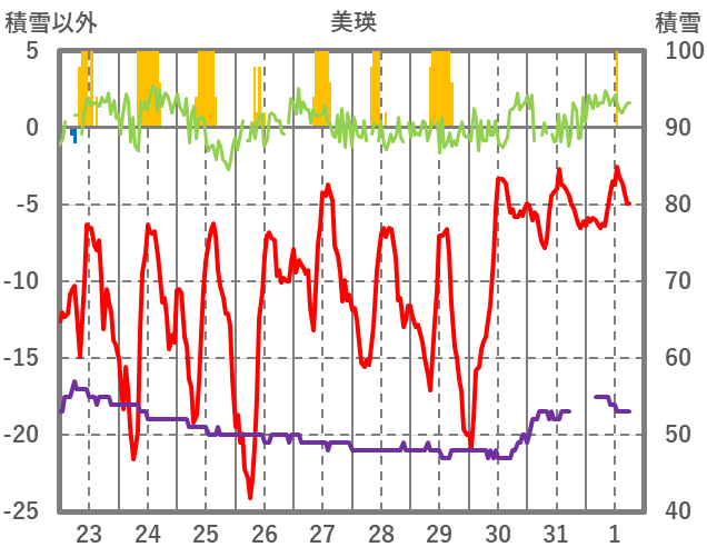 | 日 | 時 | 気温 | 降水 | 風向/風速 | 日照 | 積雪 | 降雪 |