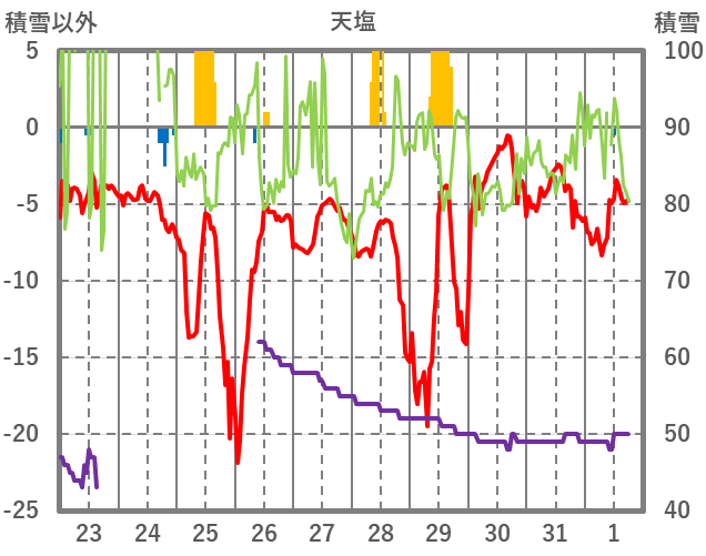 | 日 | 時 | 気温 | 降水 | 風向/風速 | 日照 | 積雪 | 降雪 |