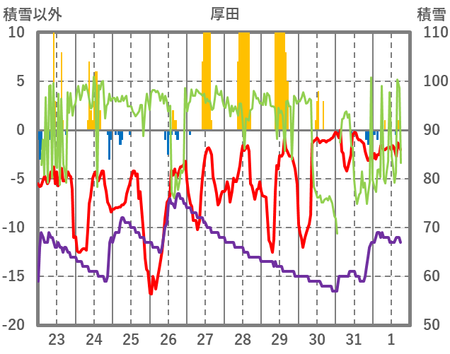 | 日 | 時 | 気温 | 降水 | 風向/風速 | 日照 | 積雪 | 降雪 |