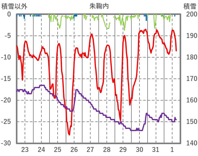 | 日 | 時 | 気温 | 降水 | 風向/風速 | 日照 | 積雪 | 降雪 |