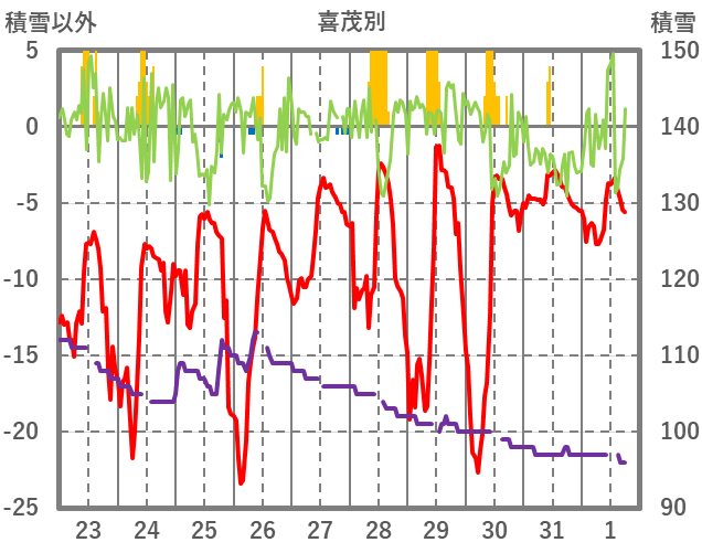 | 日 | 時 | 気温 | 降水 | 風向/風速 | 日照 | 積雪 | 降雪 |