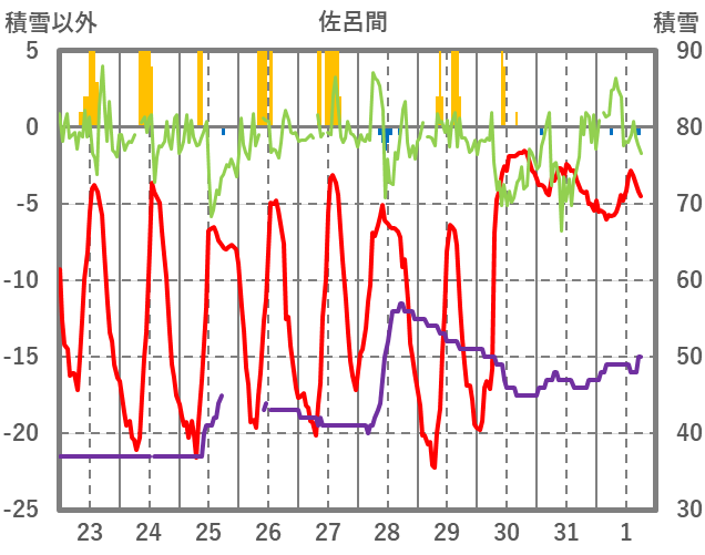 | 日 | 時 | 気温 | 降水 | 風向/風速 | 日照 | 積雪 | 降雪 |