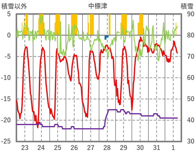 | 日 | 時 | 気温 | 降水 | 風向/風速 | 日照 | 積雪 | 降雪 |