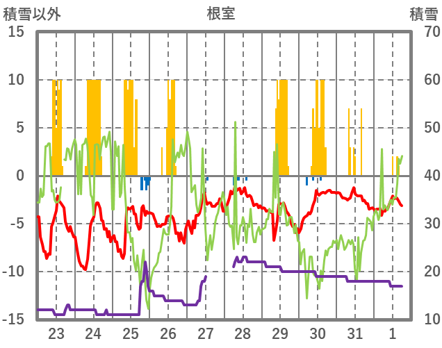 | 日 | 時 | 気温 | 降水 | 風向/風速 | 日照 | 積雪 | 降雪 |