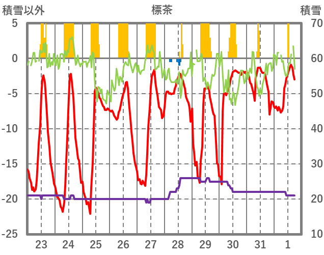 | 日 | 時 | 気温 | 降水 | 風向/風速 | 日照 | 積雪 | 降雪 |