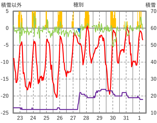 | 日 | 時 | 気温 | 降水 | 風向/風速 | 日照 | 積雪 | 降雪 |