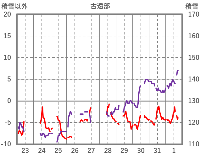 | 日 | 時 | 気温 | 降水 | 風向/風速 | 日照 | 積雪 | 降雪 |