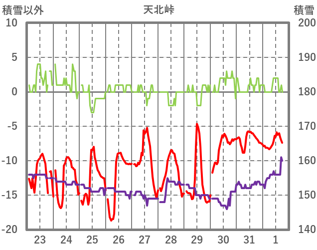 | 日 | 時 | 気温 | 降水 | 風向/風速 | 日照 | 積雪 | 降雪 |