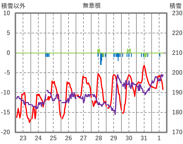 | 日 | 時 | 気温 | 降水 | 風向/風速 | 日照 | 積雪 | 降雪 |