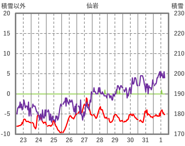 | 日 | 時 | 気温 | 降水 | 風向/風速 | 日照 | 積雪 | 降雪 |