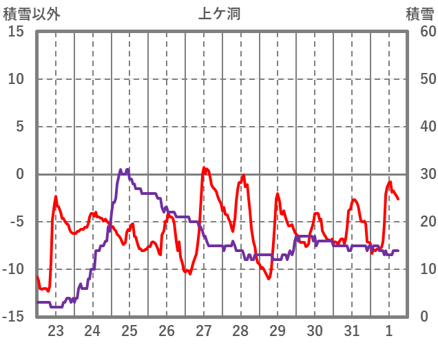 | 日 | 時 | 気温 | 降水 | 風向/風速 | 日照 | 積雪 | 降雪 |