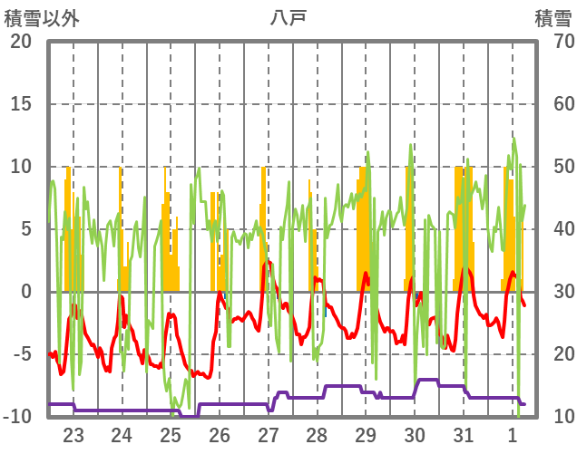 | 日 | 時 | 気温 | 降水 | 風向/風速 | 日照 | 積雪 | 降雪 |