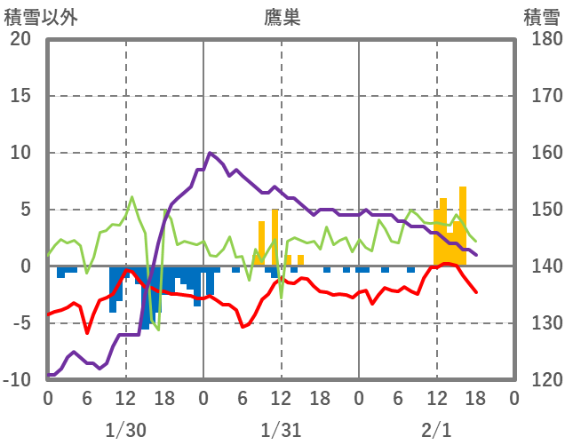 | 日 | 時 | 気温 | 降水 | 風向/風速 | 日照 | 積雪 | 降雪 |