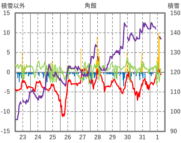 | 日 | 時 | 気温 | 降水 | 風向/風速 | 日照 | 積雪 | 降雪 |
