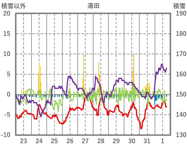 | 日 | 時 | 気温 | 降水 | 風向/風速 | 日照 | 積雪 | 降雪 |