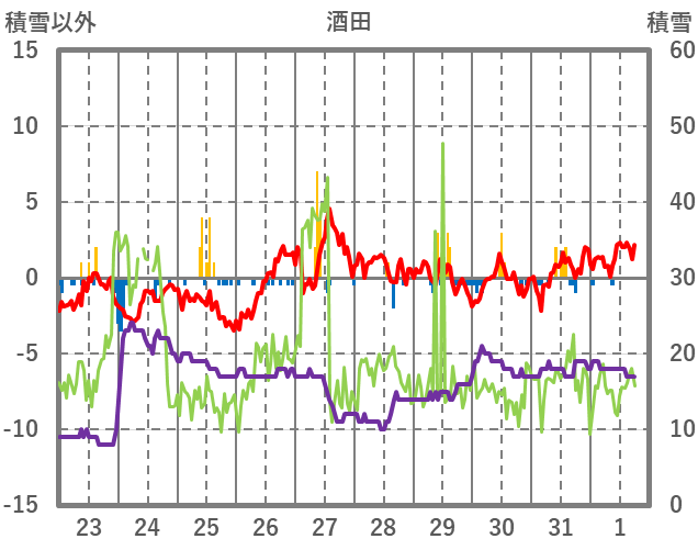 | 日 | 時 | 気温 | 降水 | 風向/風速 | 日照 | 積雪 | 降雪 |