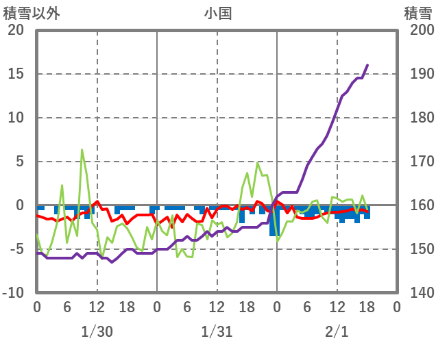 | 日 | 時 | 気温 | 降水 | 風向/風速 | 日照 | 積雪 | 降雪 |