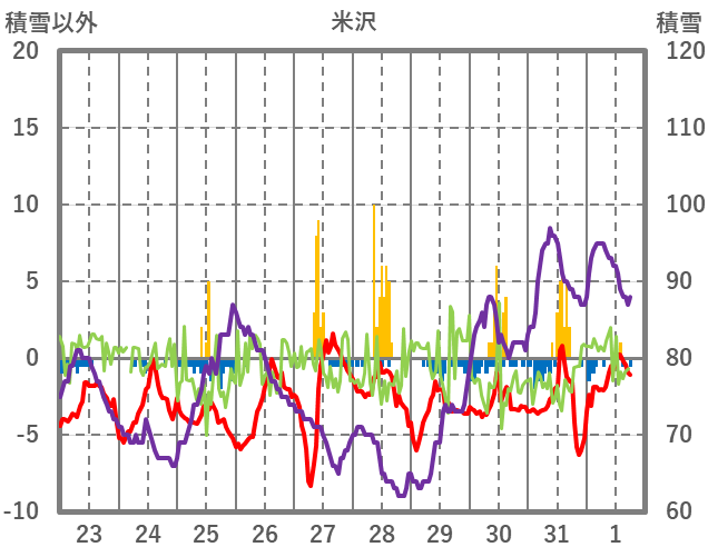 | 日 | 時 | 気温 | 降水 | 風向/風速 | 日照 | 積雪 | 降雪 |