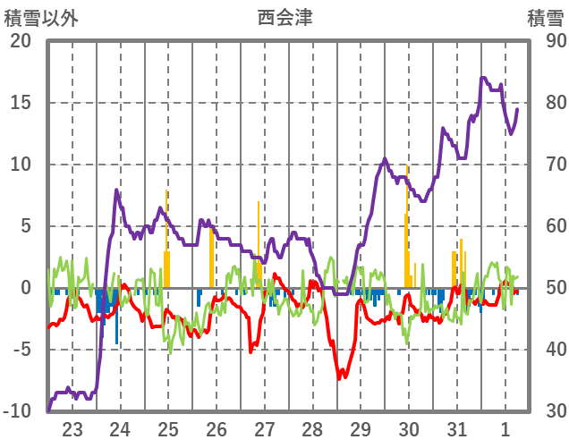 | 日 | 時 | 気温 | 降水 | 風向/風速 | 日照 | 積雪 | 降雪 |