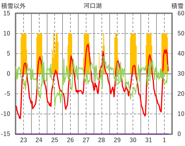 | 日 | 時 | 気温 | 降水 | 風向/風速 | 日照 | 積雪 | 降雪 |