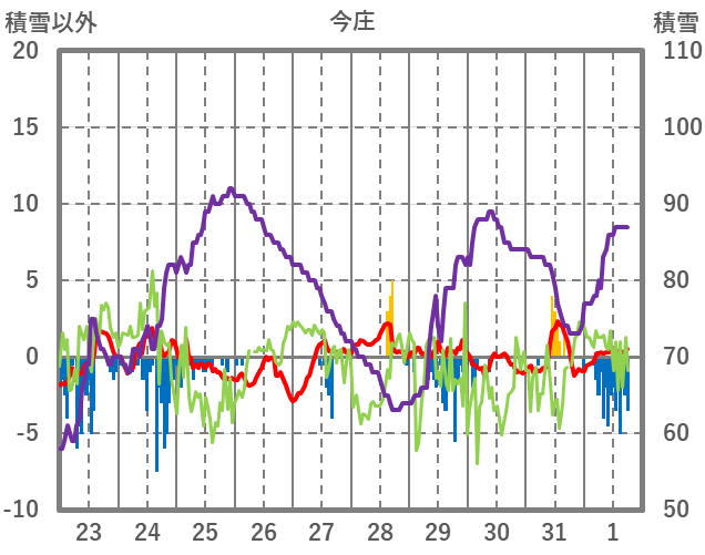 | 日 | 時 | 気温 | 降水 | 風向/風速 | 日照 | 積雪 | 降雪 |