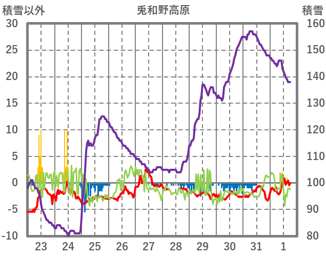 | 日 | 時 | 気温 | 降水 | 風向/風速 | 日照 | 積雪 | 降雪 |
