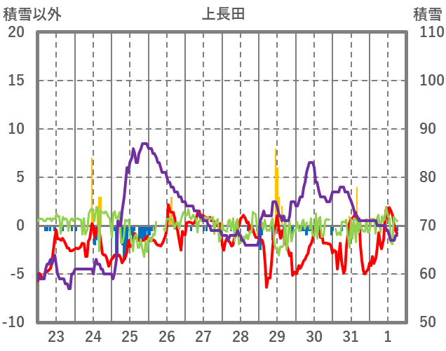 | 日 | 時 | 気温 | 降水 | 風向/風速 | 日照 | 積雪 | 降雪 |