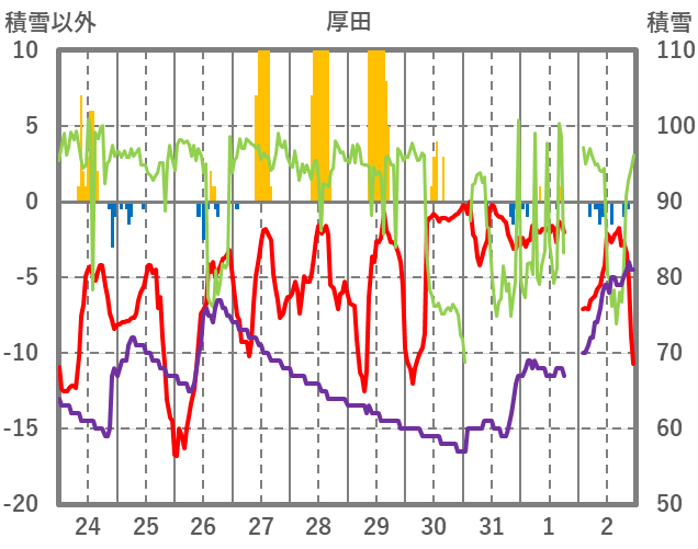 | 日 | 時 | 気温 | 降水 | 風向/風速 | 日照 | 積雪 | 降雪 |