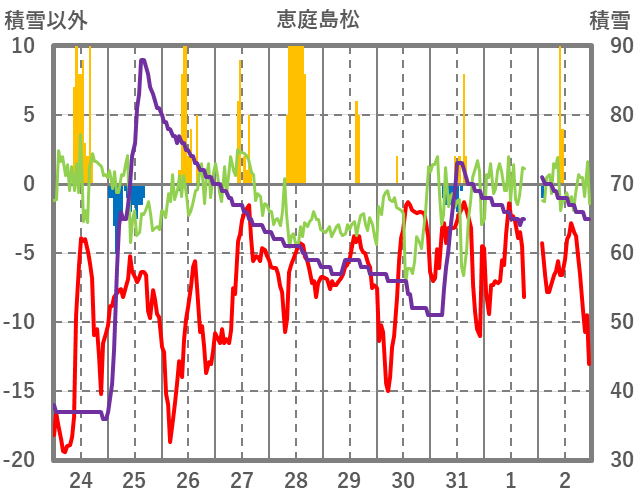 | 日 | 時 | 気温 | 降水 | 風向/風速 | 日照 | 積雪 | 降雪 |