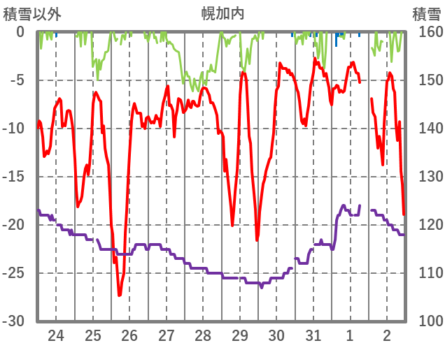 | 日 | 時 | 気温 | 降水 | 風向/風速 | 日照 | 積雪 | 降雪 |