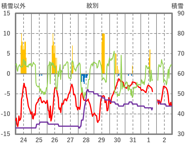 | 日 | 時 | 気温 | 降水 | 風向/風速 | 日照 | 積雪 | 降雪 |