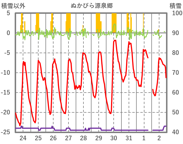 | 日 | 時 | 気温 | 降水 | 風向/風速 | 日照 | 積雪 | 降雪 |