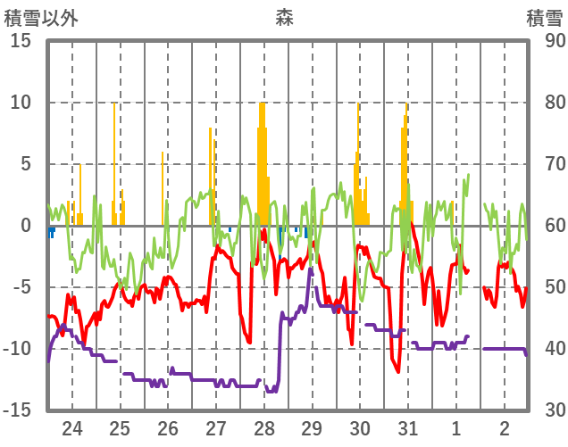 | 日 | 時 | 気温 | 降水 | 風向/風速 | 日照 | 積雪 | 降雪 |