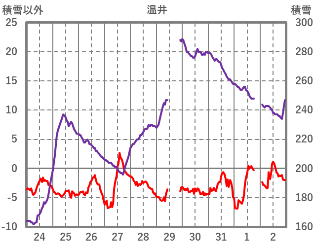 | 日 | 時 | 気温 | 降水 | 風向/風速 | 日照 | 積雪 | 降雪 |